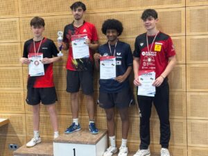 Ebenso siegreich war Ryan Jager bei der J19. Als amtierender hessischer Meister der Altersklasse und Favorit auf den Titel angetreten, musste er in der Gruppenphase nur gegen Alex Barzel aus Anspach einmal in den 5ten Satz, gewann aber letztlich auch dieses Spiel. In der KO Phase folgten dann drei klare 3:0 Siege und erst im Endspiel wurde es wieder spannender. Aber da da siegte er aber letztlich klar mit 3:1 und wurde unangefochten Bezirksmeister. Und den Titel im Doppel nahm er zusammen mit seinem Partner Soolan Olika Araso dann auch noch in überzeugender Manier mit.